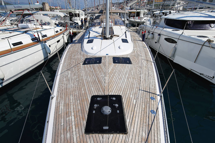 6-cabin sailing vessel Bavaria Cruiser 56, built in 2014, is docked in Croatia.