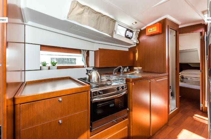 The fully equipped galley includes a fridge, oven, cooker, sink, and kitchen utensils.